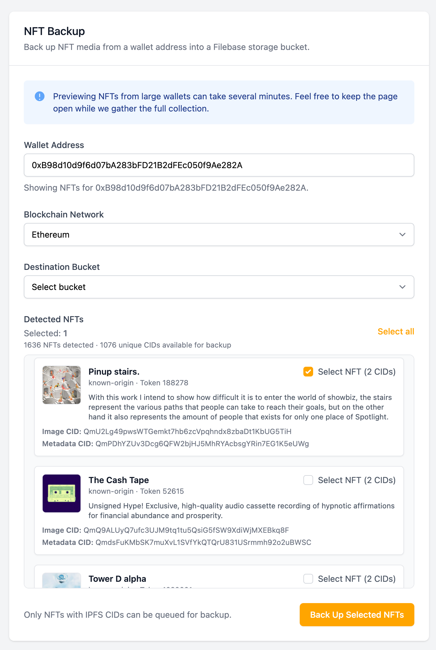 Note: For wallets with very large NFT inventories, the preview step can take several minutes — this is because Filebase is resolving, validating, and analyzing all IPFS-related content across your entire collection.